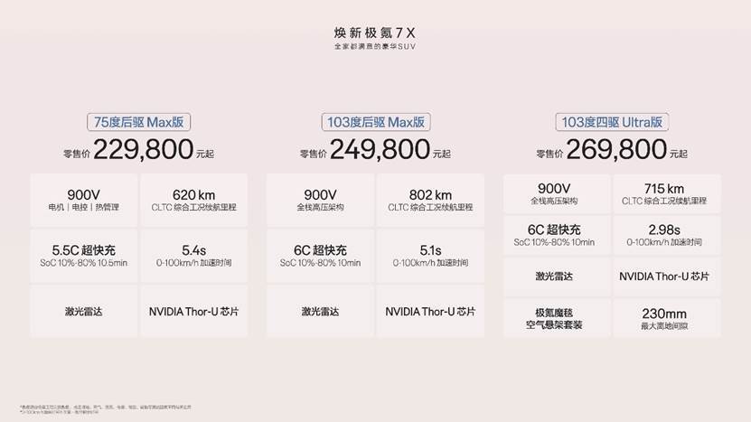 品牌旗下“全家都满意的豪华SUV”——焕新极氪7X正式上市。新车共推出三款配置:75度后驱Max版、103度后驱Max版、103度四驱Ultra版,官方零售价分别为22.98万元、24.98万元和26.98万元。在超级置换权益后,限时售价进一步下探至21.98万元起,极大提升了产品的市场竞争力。即日起,用户可通过极氪官方渠道进行预订。