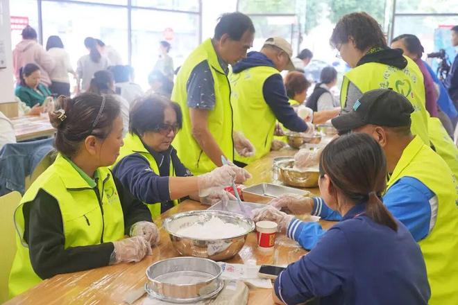 重阳将至,徐汇区华泾镇东湾社区食堂里热闹非凡。现场米粉铺桌、蒸气升腾,上海市第三社会福利院与社区的老人们围在操作台前制作传统重阳糕,节日的烟火气扑面而来。